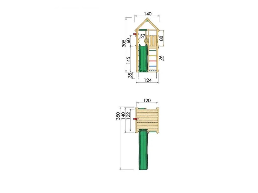 Dodávka obsahuje montážní kit, skluzavku a nakrácené tlakově impregnované dřevo a hranoly 9 x 9 cm bez předvrtání.