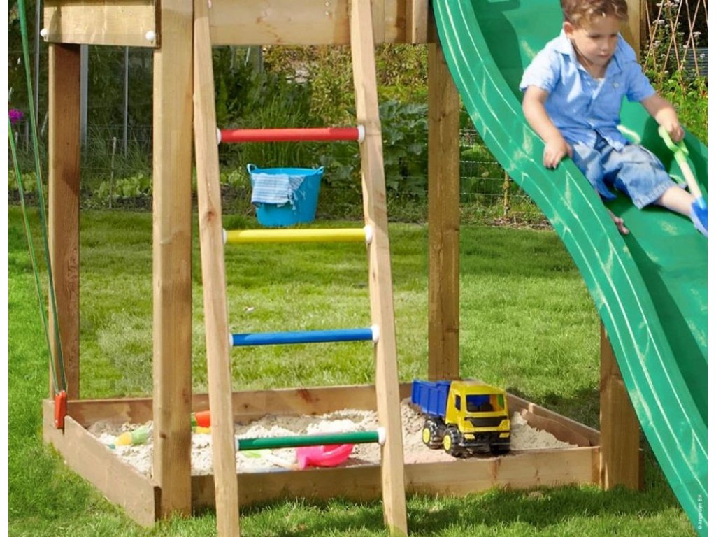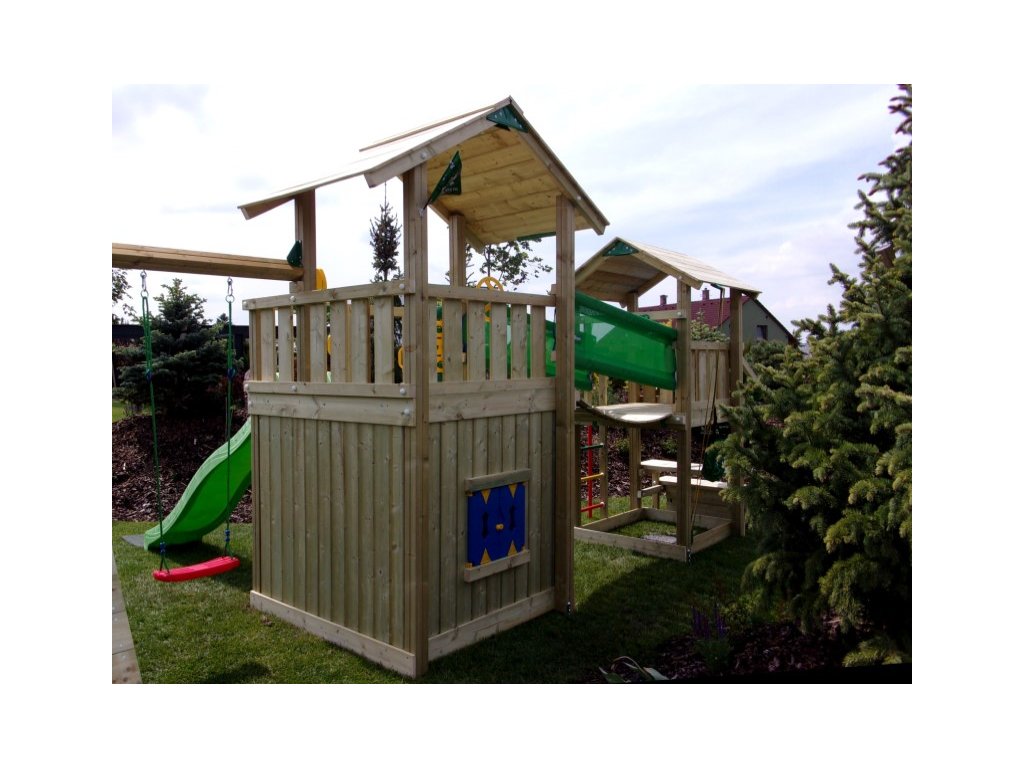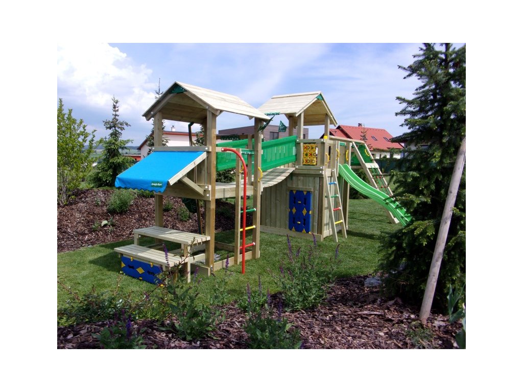 Prostor pod podestou lze využít několika způsoby. Bez potíží sem umístíte dětský nábytek nebo vyšší pískoviště. Hřiště je vyrobeno z tlakově impregnovaného dřeva, profil hlavních stojek je 9 x 9 cm.