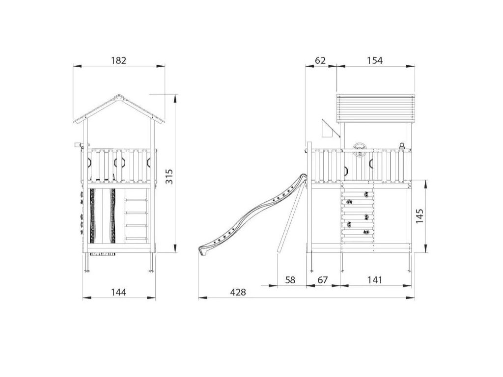 Kompletní sestava obsahuje montážní kit, nakrácené impregnované dřevo pro dřevěnou konstrukci hřiště bez předvrtání a skluzavku.