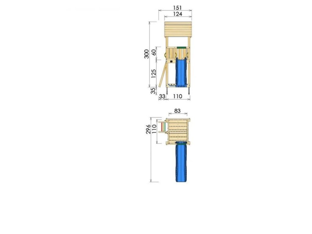 Dodávka obsahuje montážní kit, skluzavku a nakrácené tlakově impregnované dřevo a hranoly 9 x 9 cm bez předvrtání.