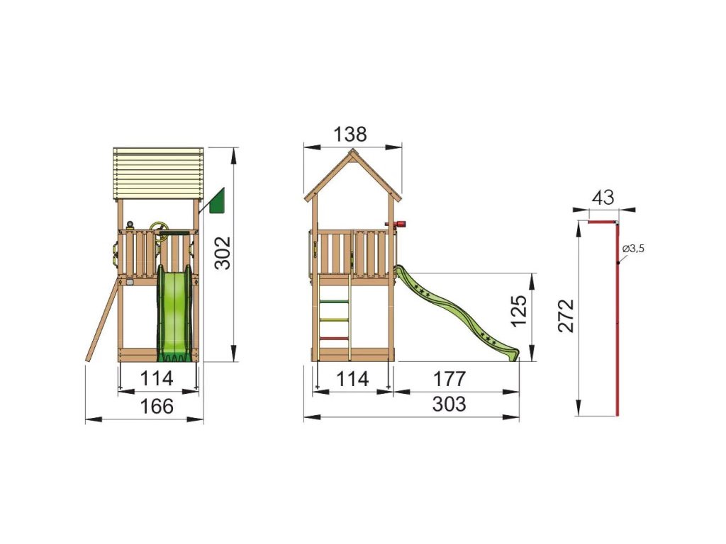 Dětské hřiště Jungle Gym Club je jedním z menších hřišť typové řady, tudíž hrací věž na Vaší zahradě nezabere příliš místa. Sestava má pevnou dřevěnou stříšku a podestu, na kterou se děti dostanou pomocí žebříku a dolů se sklouznou po skluzavce. Pro tento typ doporučujeme skluzavku o délce 220 cm, jejíž nástupní výška je 1,25 m. Jakou barvu skluzavky Vám dodáme, je pouze na Vás - nabídnout Vám můžeme žlutou, červenou, zelenou, modrou, fialovou a dva odstíny zelené. Barvu si prosím vyberte v kolonce varianta.