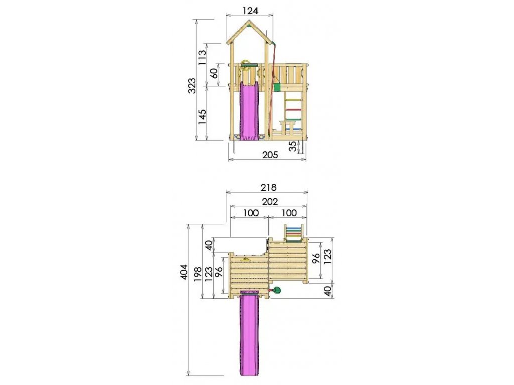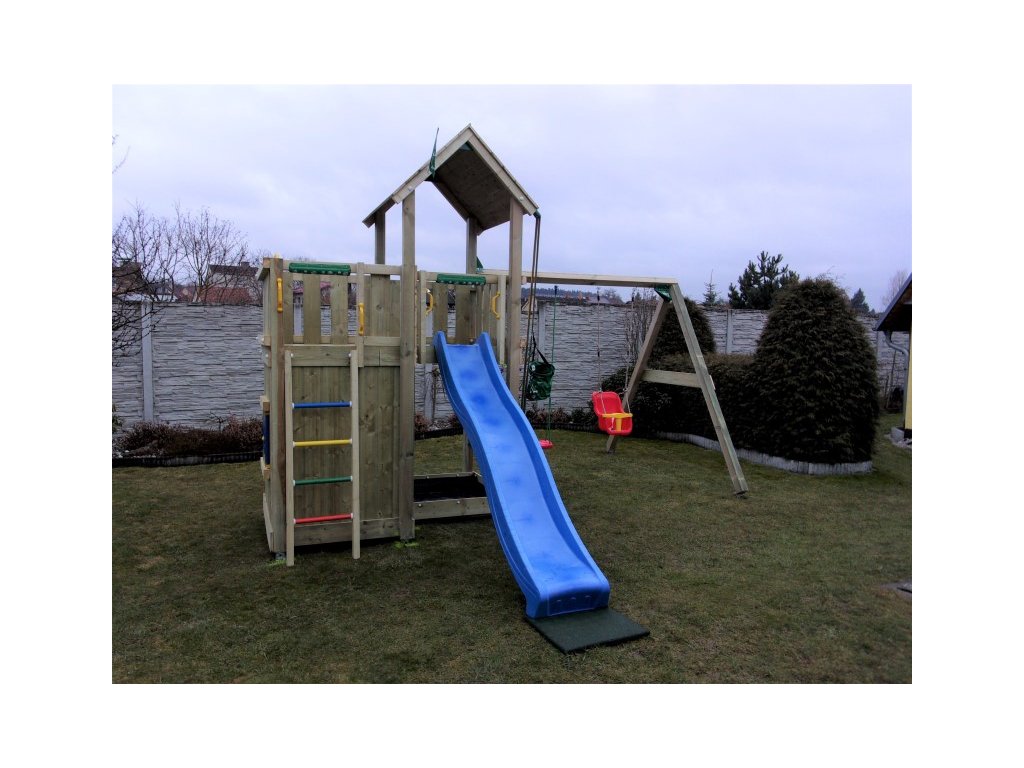Neodmyslitelnou součástí hrací věže je beze sporu skluzavka. Na hřiště se připojuje pouze skluzavka o délce 265 cm s nástupní výškou 1,45 m. Barva skluzavky je pouze na Vás - můžeme Vám nabídnout z červené, žluté, modré, fialové a dvou odstínů zelené. Barvu si prosím vyberte v kolonce varianta. Hřiště vyrábíme z tlakově impregnovaného dřeva, profil hlavních stojek je 9 x 9 cm .