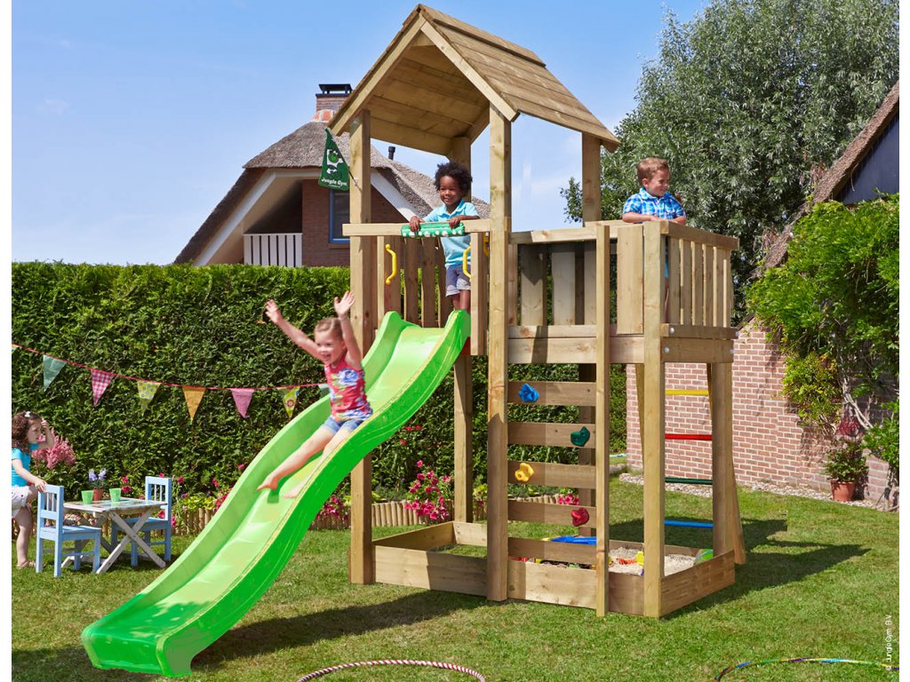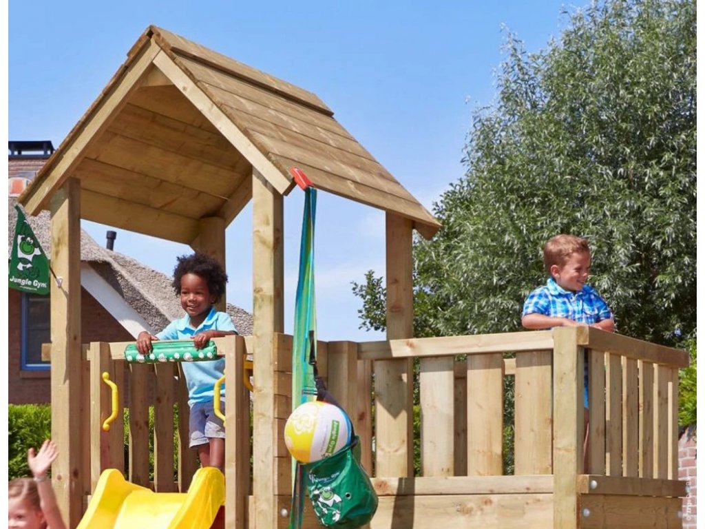 Dětské hřiště Jungle Gym Mansion je jedním z největších hřišť v nabídce Jungle Gym. Hrací věž je opatřena pevnou dřevěnou střechou a další nezastřešenou boční podestou, která horní část sestavy rozšiřuje. Spodní část je prostorná a je možno ji doplnit dětským nábytkem nebo pískovištěm, ke kterému standardně patří síť proti kočkám. Pokud si budete přát opatřit pískoviště pevným krytem, na vyžádání Vám sestavu doplníme o hoblované latě na jeho smontování.