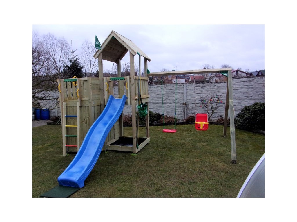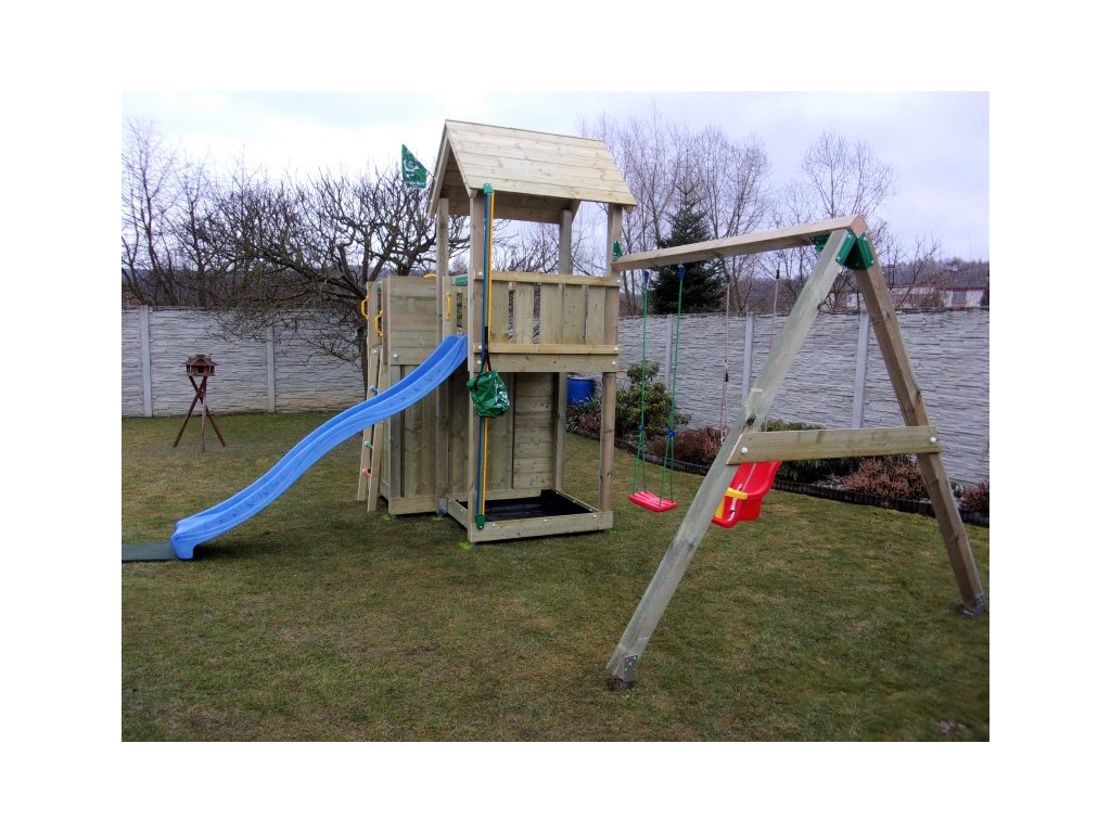 Kompletní sestava obsahuje montážní kit, nakrácené impregnované dřevo pro dřevěnou konstrukci hřiště a skluzavku.