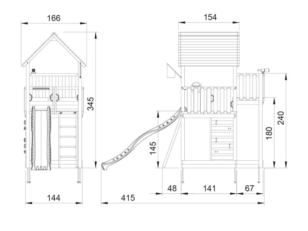 Kompletní sestava obsahuje montážní kit, nakrácené impregnované dřevo pro dřevěnou konstrukci hřiště a skluzavku.
