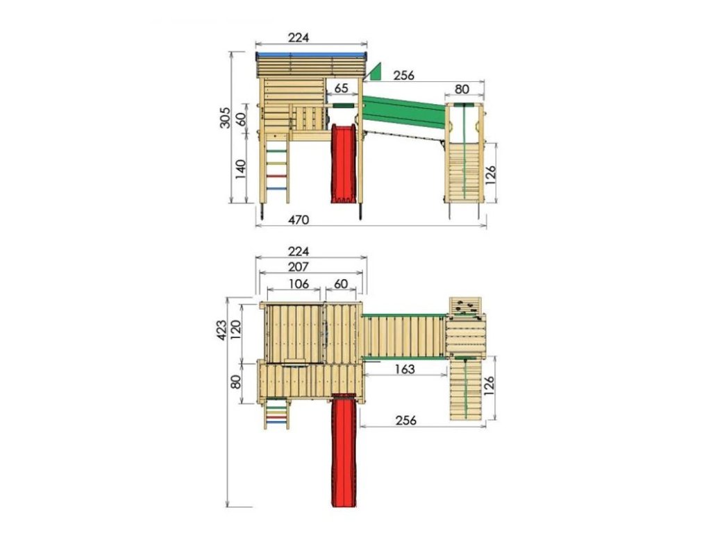 Dodávka obsahuje montážní kit, skluzavku a nakrácené tlakově impregnované dřevo a hranoly 9 x 9 cm bez předvrtání.