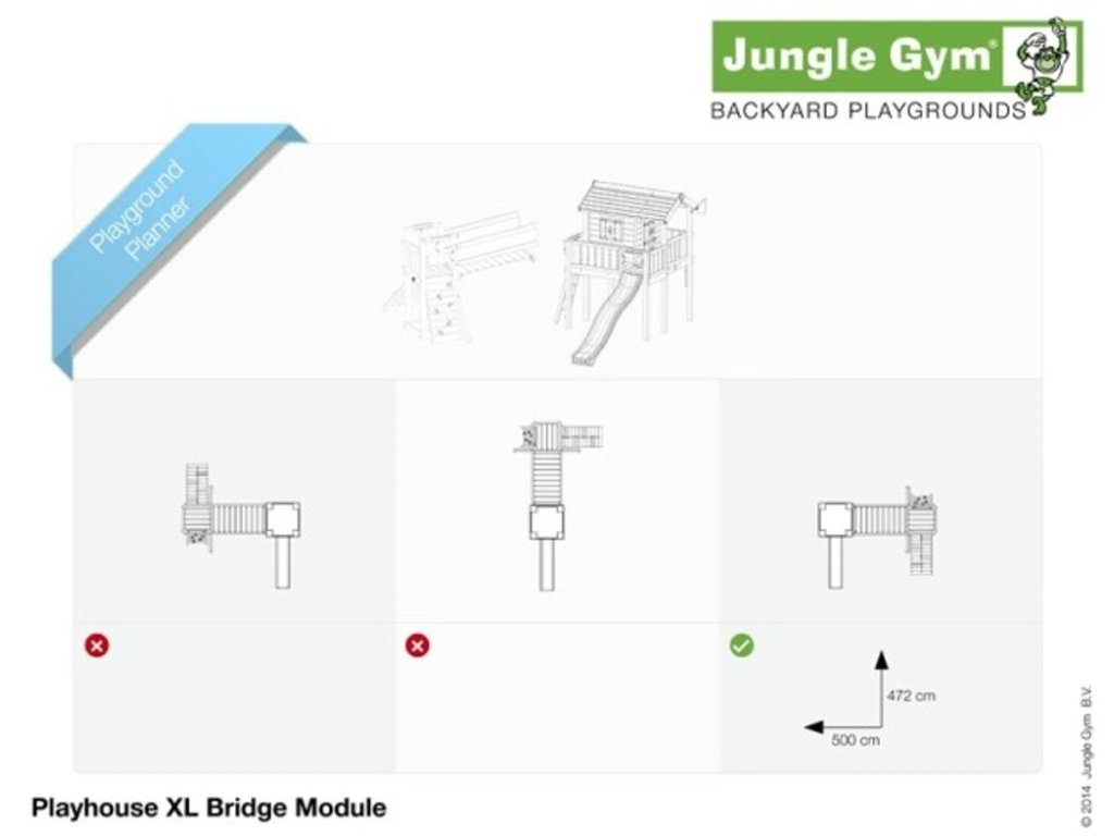 Bridge modul Vašim dětem zajistí rozmanité aktivity a spousty zábavy. Velmi oblíbený modul vhodný pro všechny sestavy. Sestava Bridge Modul je největší rozšiřující příslušenství pro dětská hřiště řady Jungle Gym. Samostatná věž s nástupní plošinou obsahuje horolezeckou stěnu, šplhací lano a šplhací hladkou stěnu a s hlavní hrací věží je propojena spojovacím můstkem s pohyblivou podlážkou a bočním zábradlím, které zajišťuje maximální bezpečnost pro Vaše děti. Výborně se doplňuje s modulem Bridge Link, kdy můžete propojit dvě věže dětského hřiště a vytvořit tak velkou hrací sestavu.