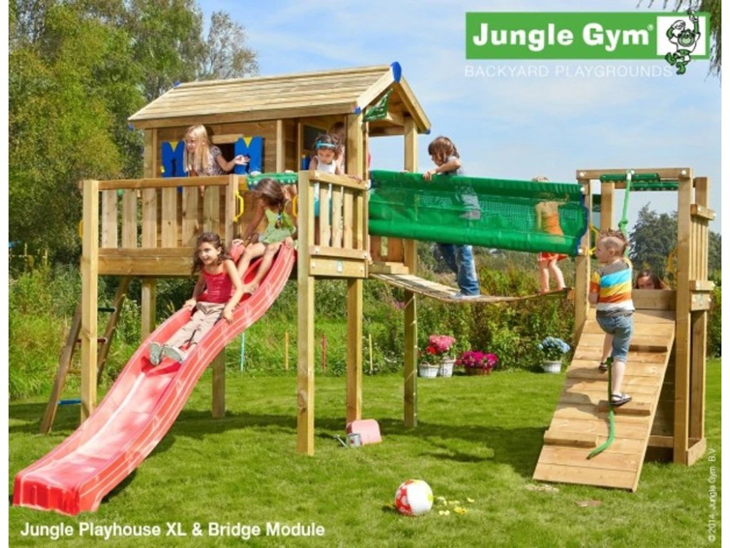 Dětská hřiště holandského výrobce Jungle Gym jsou řešením k vytvoření Vašeho vlastního dětského hřiště. Jednoduchá stavebnice umožňuje sestavit dětské hřiště vlastními silami, jedná se o klasický typ do-it-yourself - udělej si sám. Do stavby domečku se tak může zapojit celá rodina a stavba se tak stane pro děti i rodiče zajímavou rodinnou aktivitou. Pokud si na montáž netroufáte, rádi Vám domeček s terasou namontujeme přímo na Vaší zahradě. Dětský zastřešený domeček Jungle Playhouse s terasou L a skluzavkou je další hrací sestava pro vaše děti a jejich kamarády. Dětská hřiště rozvíjejí jejich pohybovou aktivitu a motoriské schopnosti. Vše dodáváme z impregnovaného dřeva.