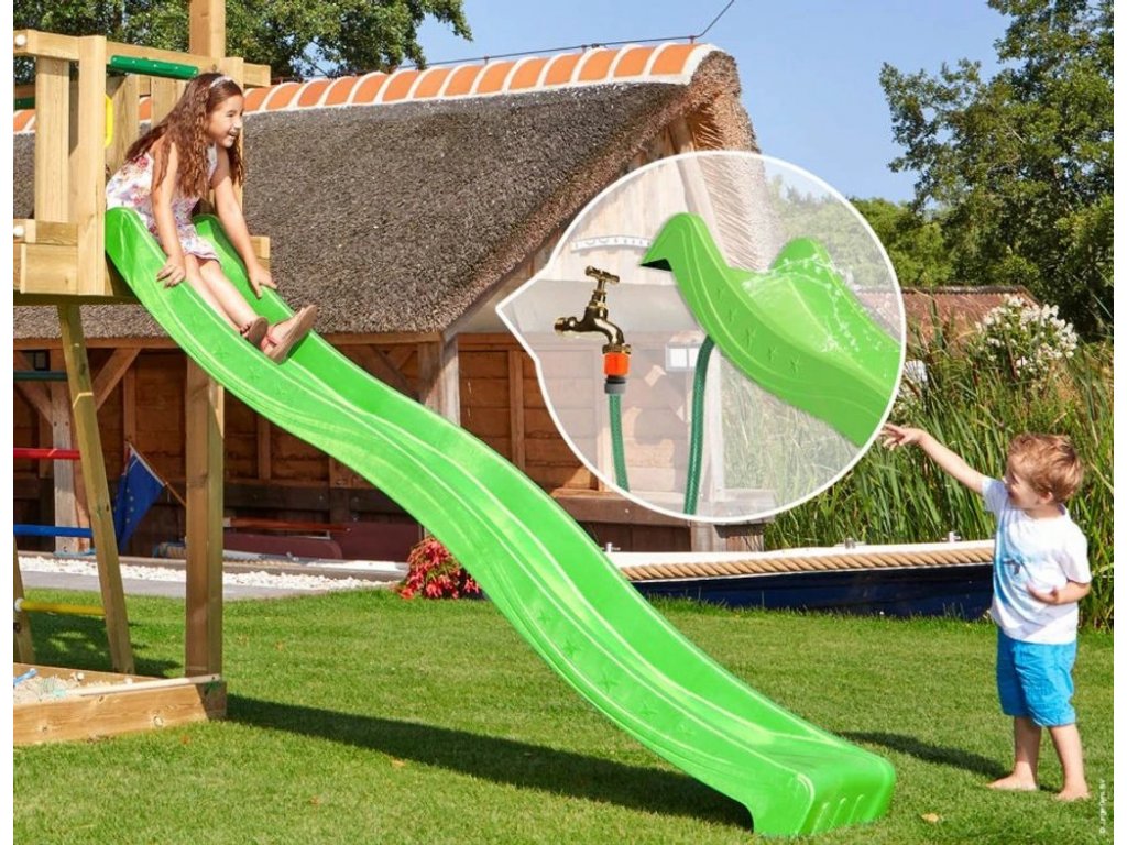 Skluzavka světle zelené barvy určená pro hřiště a dětské sestavy s nástupní podestou 145 - 150 cm od země. Skluzavka má přípojku pro připojení hadice a děti se tak mohou v létě a při teplém počasí klouzat i "mokrou cestou". Přípojku samozřejmě můžete nebo nemusíte použít, při obyčejném klouzání nepřekáží. Při horkém počasí se skluzavka zároveň vodou ochladí a i pro děti to bude příjemné osvěžení. Pozor však, aby voda nebyla příliš studená.